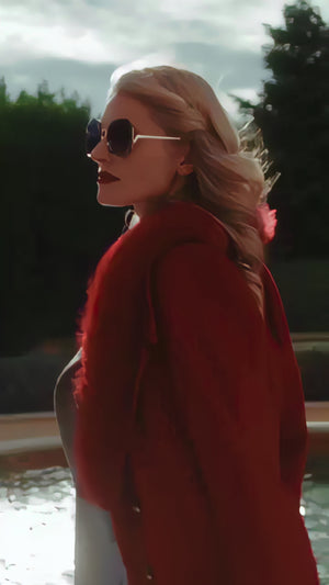 She walks through a golden courtyard, the air sharp and still. The coat catches the light like a promise kept. Her lips match the hue, deliberate and unapologetic. The blazer fits like discipline, the pants follow like conviction. There is no rush, only intent. Every step has purpose, every glance knows its weight.