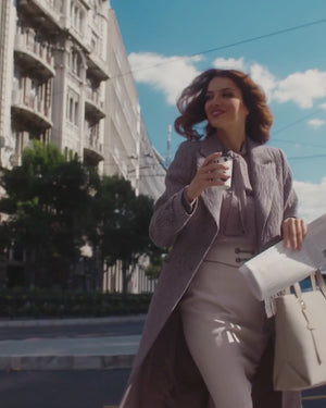 Then Isidora arrives. The coat does not shout. It simply wraps her in textured grace, the kind you notice a moment after she passes. The lining breathes. The collar holds its form. She takes her coffee, folds the paper under her arm, and the city seems to slow to her tempo.