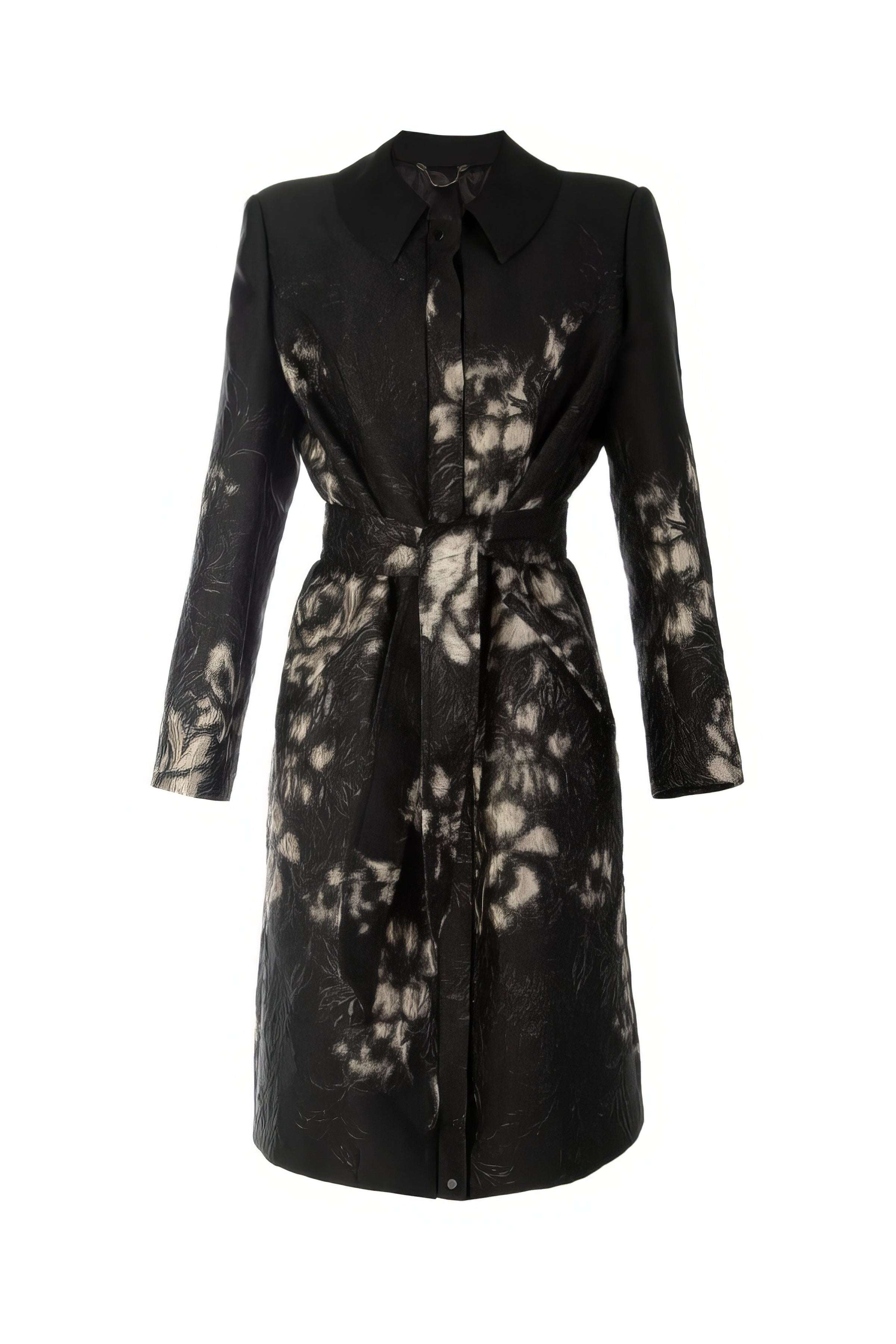 The Emma Light Coat in Silver Floral Jacquard blends sculpted tailoring with a refined metallic sheen. Woven on a deep black base, the jacquard blooms in soft silver—catching the light with a subtle glow that elevates day and evening looks alike. A waist‐defining self-tie belt shapes the figure, while the clean front with hidden press buttons preserves a sleek, minimalist line.