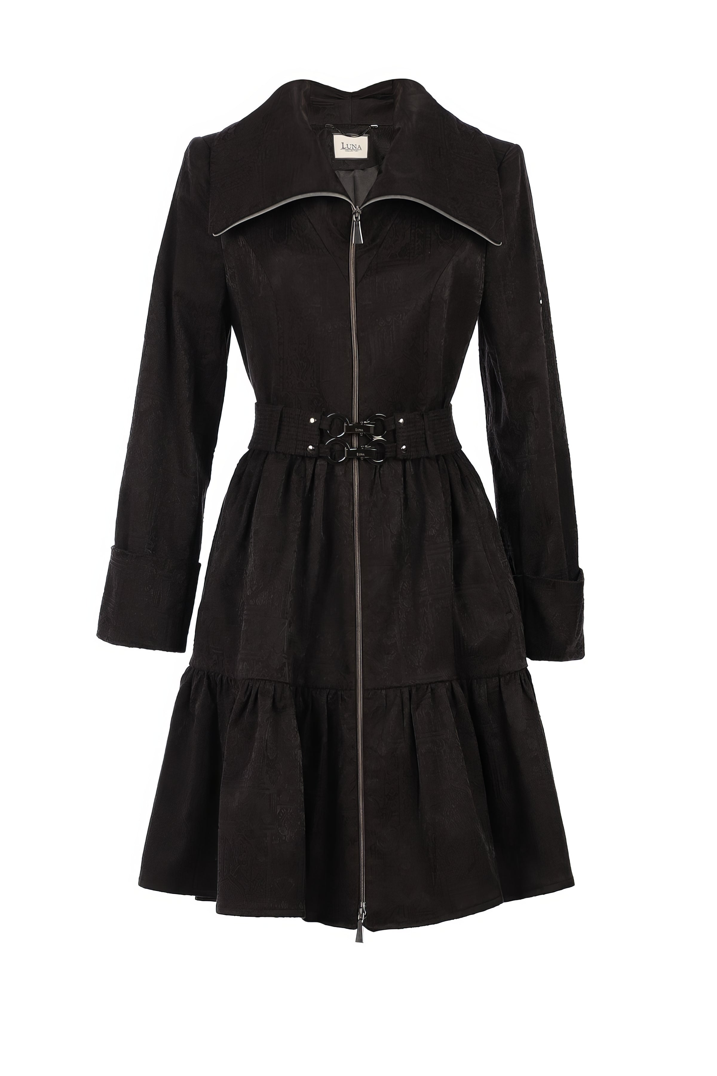 The Iris Short Tailored Coat in Deep Black blends feminine movement with modern structure. Made from a soft European cotton blend, it has a subtle satin finish that reflects light beautifully. The full front zipper closure and double-ring belt create a defined silhouette, while the tiered hemline adds volume and charm. The wide collar frames the neckline with quiet confidence, making this piece as elegant as it is effortless. Perfect for both day and evening, it layers easily over dresses or trousers. Crafted in Europe for timeless appeal and comfort.