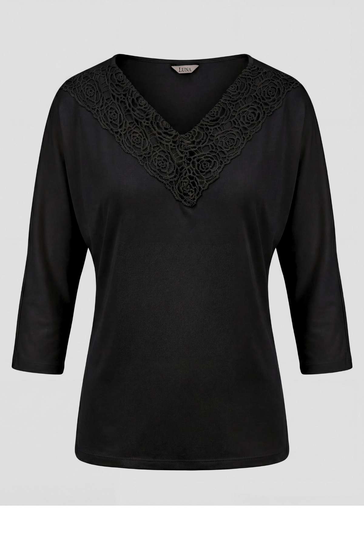The black lace elegant blouse from Luna Fashion House embodies European artistry and modern femininity. Crafted from a soft viscose blend, it offers effortless comfort with a refined finish. Designed with 3/4 sleeves and a flattering V-neckline, it is ideal for evening occasions, galas, and special celebrations.
