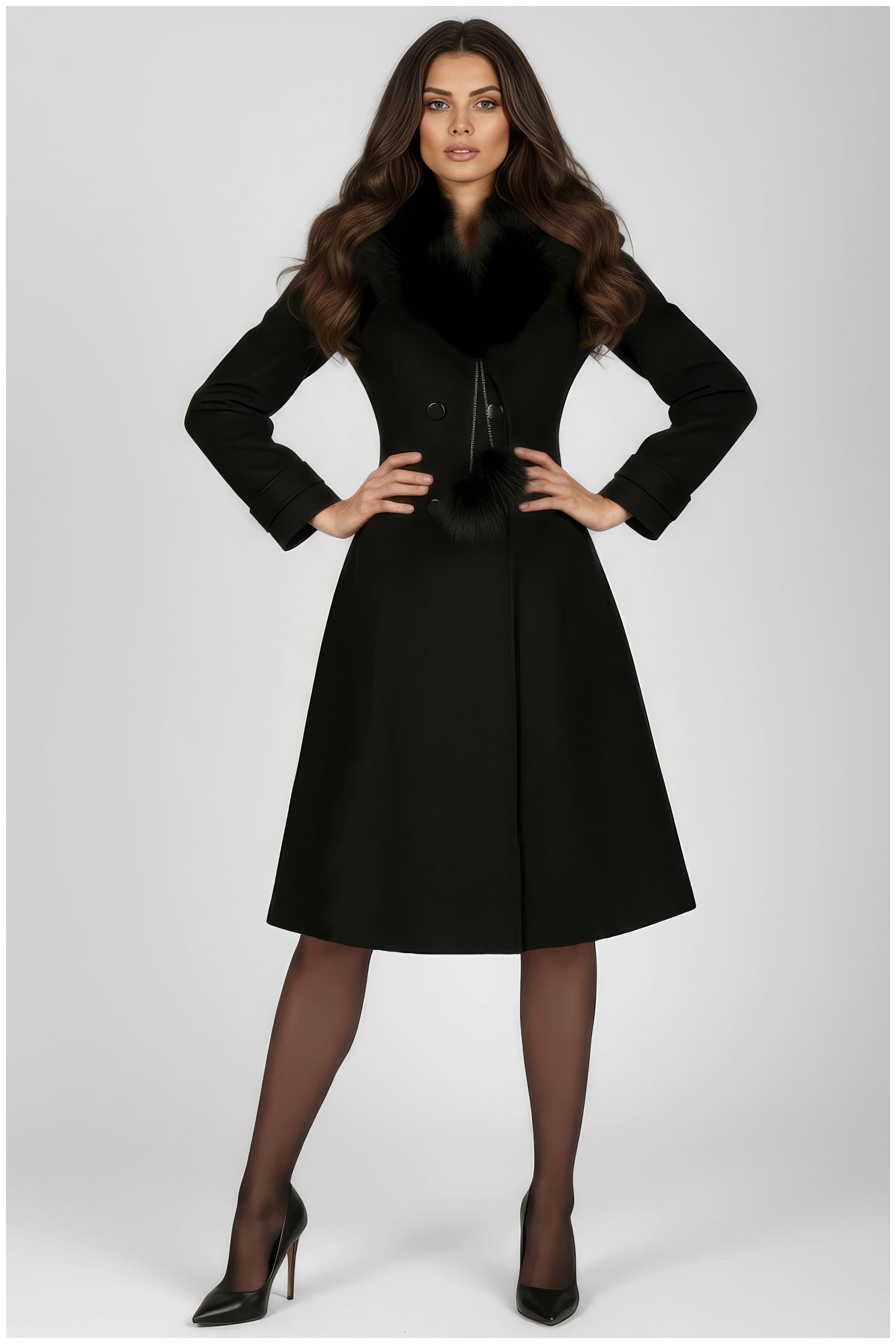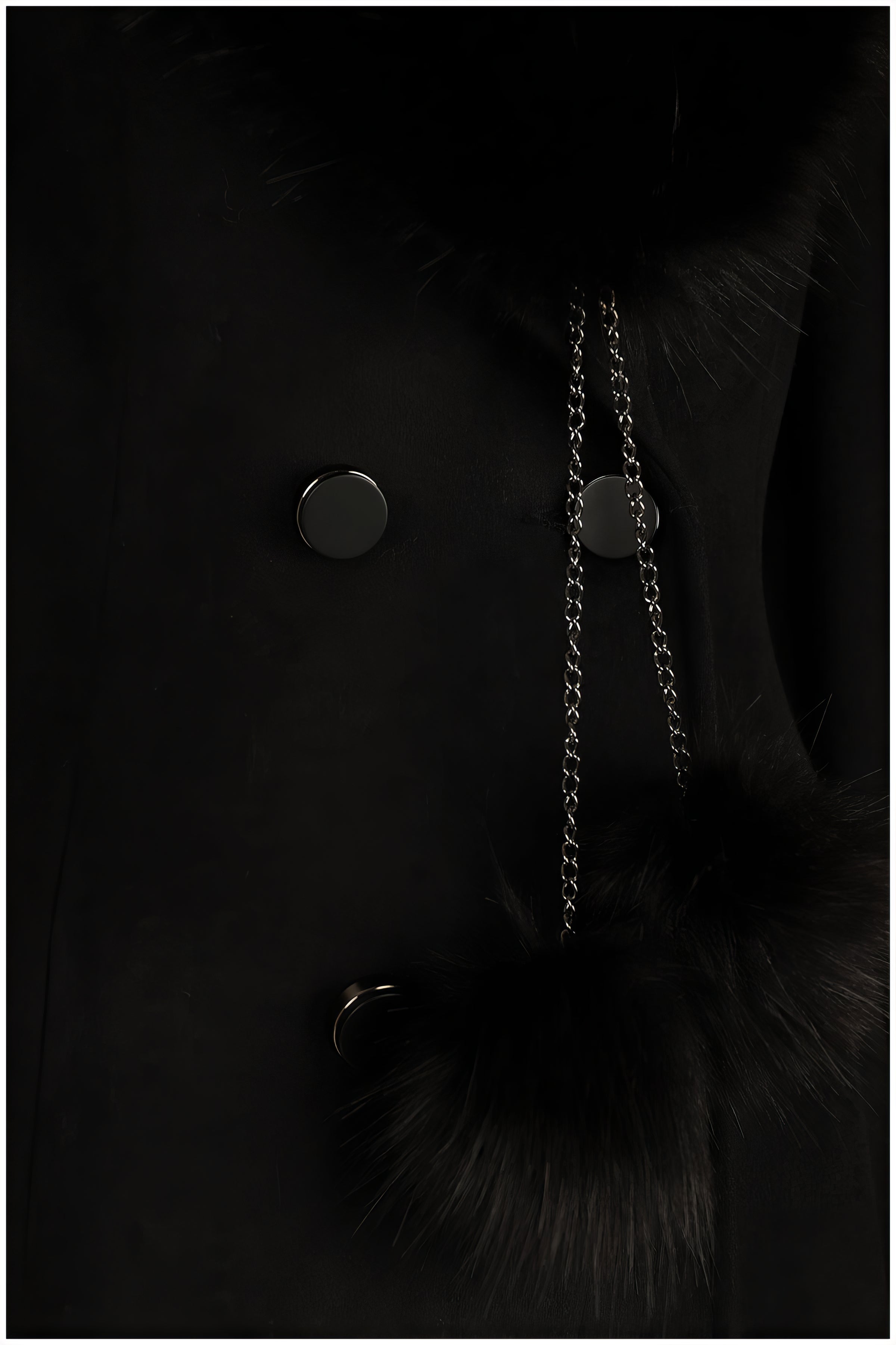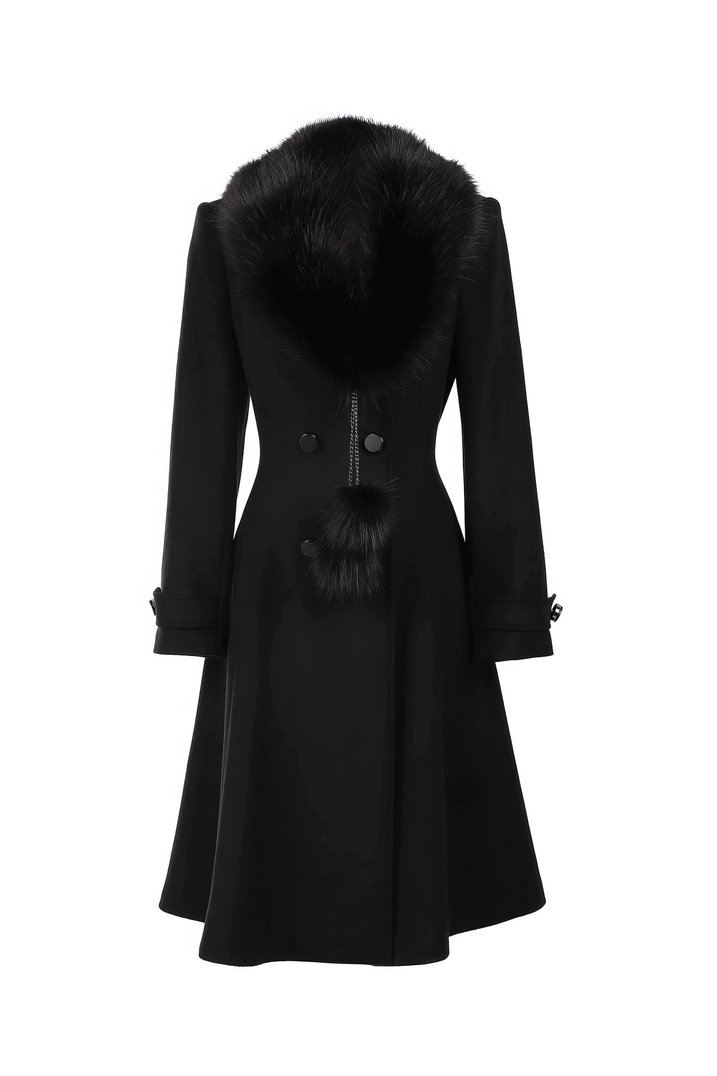 The statement fur collar adds depth and drama, framing the neckline with soft texture and elevating the entire ensemble. Thoughtfully crafted details—such as the double-breasted front, structured cuffs, and back pleats—reflect Luna Fashion House’s commitment to elegance and European craftsmanship.