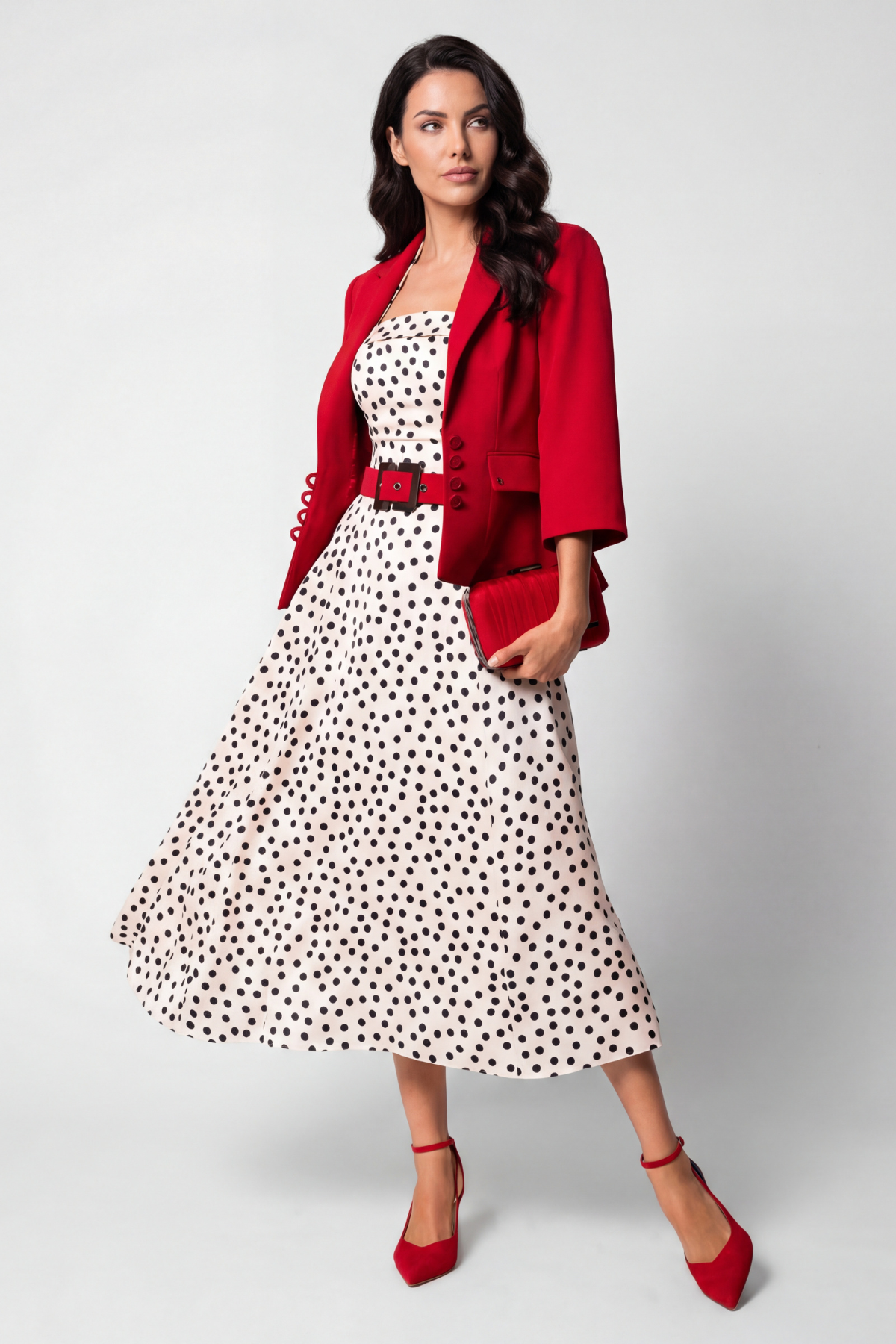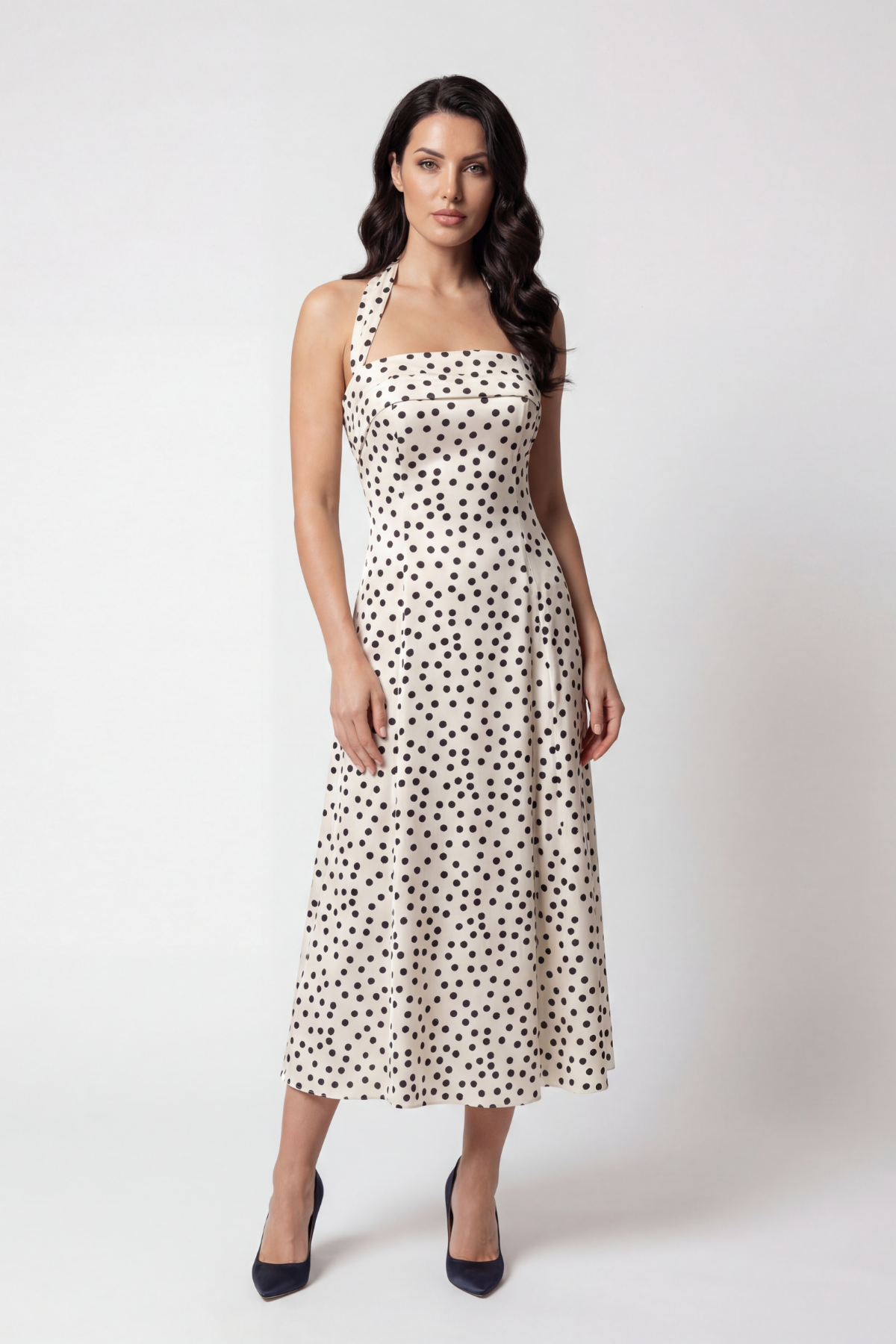 Crafted from high-quality satin and adorned with contrasting black polka dots, this dress is designed to enhance your confidence and elevate your wardrobe.
