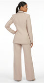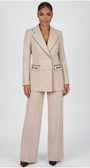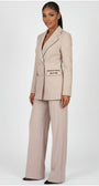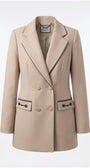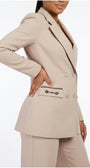 The Natasha Tailored Blazer in Sand Beige captures modern femininity through clean lines and sculpted structure. Crafted from refined European polyester with a smooth, soft hand, it shapes the body with quiet precision. The double-breasted design features delicate pocket detailing and tonal stitching that accentuates its elegant silhouette.