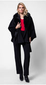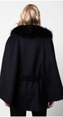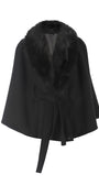 The Selina Wool Cape in Black blends fluid tailoring with quiet drama. Cut to drape gracefully over the shoulders, it delivers warmth and ease without sacrificing polish. The rich wool blend holds its sculpted shape, while the plush faux fur collar frames the neckline with a refined glow. A self-tie belt cinches the waist to create a flattering silhouette that moves effortlessly from day to evening. Pair with tailored trousers or a sleek dress for a look that feels composed and confident.